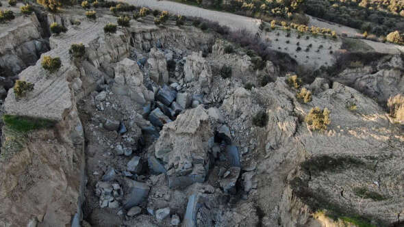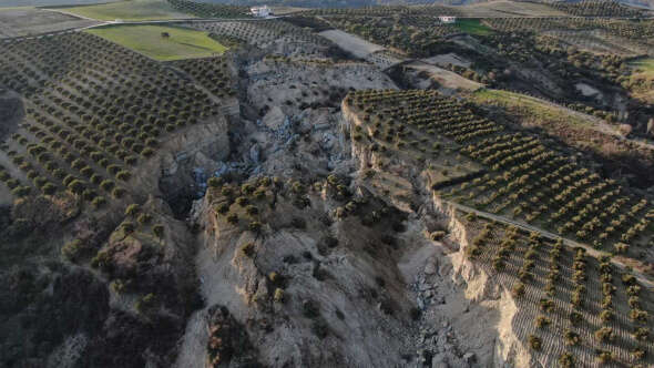 Hatay'da deprem sonrası bir köydeki zeytin tarlasını ikiye bölen 30 metre derinliğinde yaklaşık 200 metre genişliğinde dev bir yarık oluştu. Bölge sakinleri depremde büyük bir patlama sesi duyduğunu ifade etti.