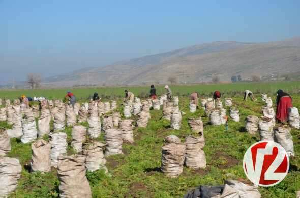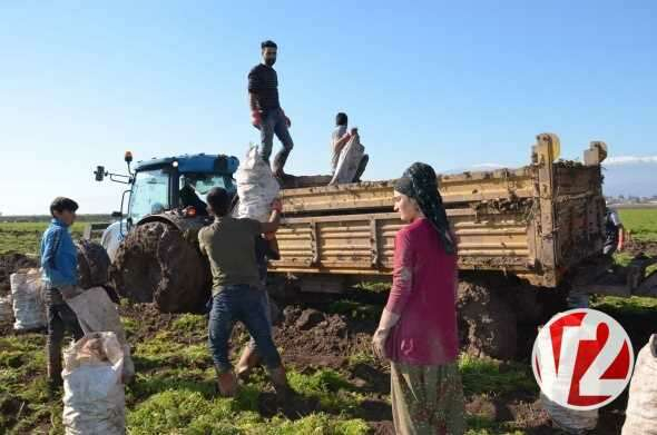 Erkekler, çamurlu tarlalarda söküm işlemini gerçekleştirirken, kadınlar da ürünlerin saplarını koparıp çuvallara istifliyor.
