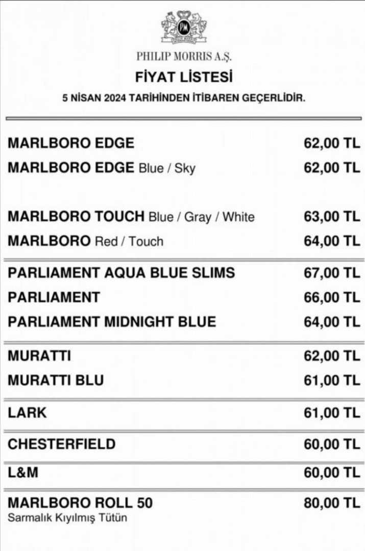 5 Nisan 2024 tarihinden itibaren geçerli olmak üzere Philip Morris grubu sigaralara zam geldi.