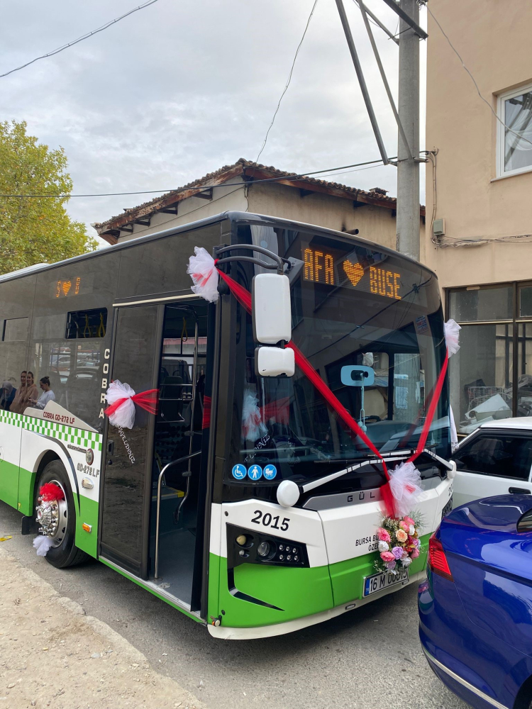 Bursa'nın Orhaneli ilçesinde evlenen Safa ve Buse çiftinin düğün konvoyunda şehir içi hatta çalışan özel halk otobüsü balon ve kurdelelerle süslenerek gelin arabası gibi korteje katıldı. Renkli görüntüler konukların cep telefonlarına yansıdı.