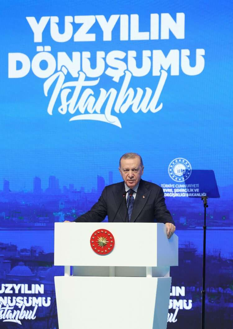 Depremle mücadeleyi önce zihinlerde başlatmamız gerektiğini aktaran Cumhurbaşkanı Erdoğan, “Deprem değil çürük, sağlıksız, dayanıksız bina öldürür ilkesini tamamen özümsemeden hiçbir yere varamayız. Tartışmasız bir şekilde Türkiye'nin birincil meselesi yapı stokunun süratle yenilenmesidir. Bu sebeple başta İstanbul olmak üzere 81 vilayetimize yapacağımız en büyük iyiliğin kentsel dönüşüm hamleleri olduğuna inanıyoruz. Aynı şekilde bu çabaları dinamitleyenler de ülkeye ve millete ihanet ediyor demektir. Bunu sadece biz değil esas rakamlar söylüyor. Bakınız burada sizlere ve ekranları başında bizleri izleyen vatandaşlarıma fikir vermesi için bazı istatistikleri paylaşmak arzusundayım. Türkiye genelinde 31 milyon konut ve 5 milyon ticari alandan oluşan 36 milyon bağımsız bölüm bulunuyor. Bunların 6 milyonu şu anda risk altında. 2 milyonun ise acilen dönüşmesi lazım. Bu gerçeklerin ışığında göreve geldiğimiz andan itibaren bu meseleye özel önem ve öncelik verdik. 2012 yılında tarihimizde ilk defa kentsel dönüşüm yasasını çıkardık. Toplam 2 milyon 200 bin bağımsız bölümün dönüşümünü tamamladık. Kentsel dönüşüm çalışmaları için 480 milyar liralık kaynak harcadık. 400 bin bağımsız bölümün dönüşümü halen devam ediyor. TOKİ başkanlığımız vasıtasıyla 1 milyon 300 binden fazla konut ürettik. Milyonlarca vatandaşımızı gecekondu denilen sağlıksız yapılardan kurtararak modern, güvenilir, dayanıklı yuvalarına kavuşturduk. Yalnızca kentsel dönüşüm ve sosyal konut projeleri ile 13 milyonu aşkın insanımızın hayatına dokunduk” şeklinde konuştu.