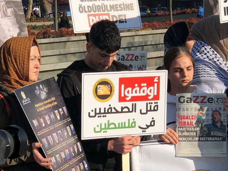 İsrail’in 7 Ekim’de Gazze’ye yönelik saldırılarının artması ile bütün dünyadan Filistin’e destek mesajları geldi. İsrail aleyhine yapılan eylemlerden biri de Filistin İçin Gazeteci Dayanışması’nın düzenlediği eylem oldu. İstanbul’da Beşiktaş Meydanı dahil olmak üzere Eminönü, Kadıköy, Mecidiyeköy, Bakırköy ve Üsküdar’da da basın açıklaması yapan grup, saldırıların başladığı günden beri 97 gazetecinin öldürüldüğüne dikkat çekti.