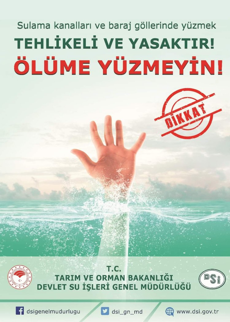 Havaların ısınmasıyla birlikte baraj, gölet, sel kapanı, regülatör, sulama kanalı gibi su depolama ve iletim tesislerine serinlemek ve yüzmek için giren vatandaşlarımızın sayısında artış gözlemlenmektedir. Su depolama ve iletim tesisleri yüzmek ve serinlemek için son derece uygunsuz tesisler olup bu tesislere girilmesi ölümcül neticeler doğurmaktadır.