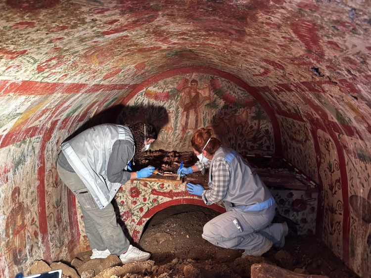 Mezarın kuzey duvarına bitişik klinein pişmiş toprak kare levhalarla kaplı olduğu, ölülerin bu levhaların üzerine yatırıldığı belirlendi. Klinein ardındaki kuzey duvarında ise nadir görülen 'Çoban İsa' figürü dikkat çekti.