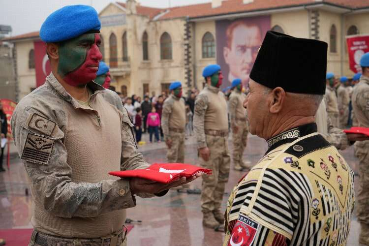 Kuvayımilliye birlikleri gösteri sonunda komandoya Türk bayrakları takdim etti.