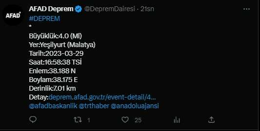 Afet ve Acil Durum Yönetimi Başkanlığı (AFAD), Malatya'nın Yeşilyurt ilçesinde 4 büyüklüğünde deprem meydana geldiğini duyurdu.