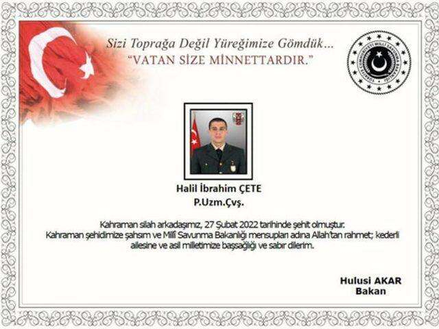 Bakanlık yaptığı açıklamada, "Pençe Yıldırım Harekatı bölgesinde bir üs bölgemizde meydana gelen silah kazası sonucunda P. Uzm. Çvş. Halil İbrahim Çete şehit oldu" ifadelerine yer verdi.