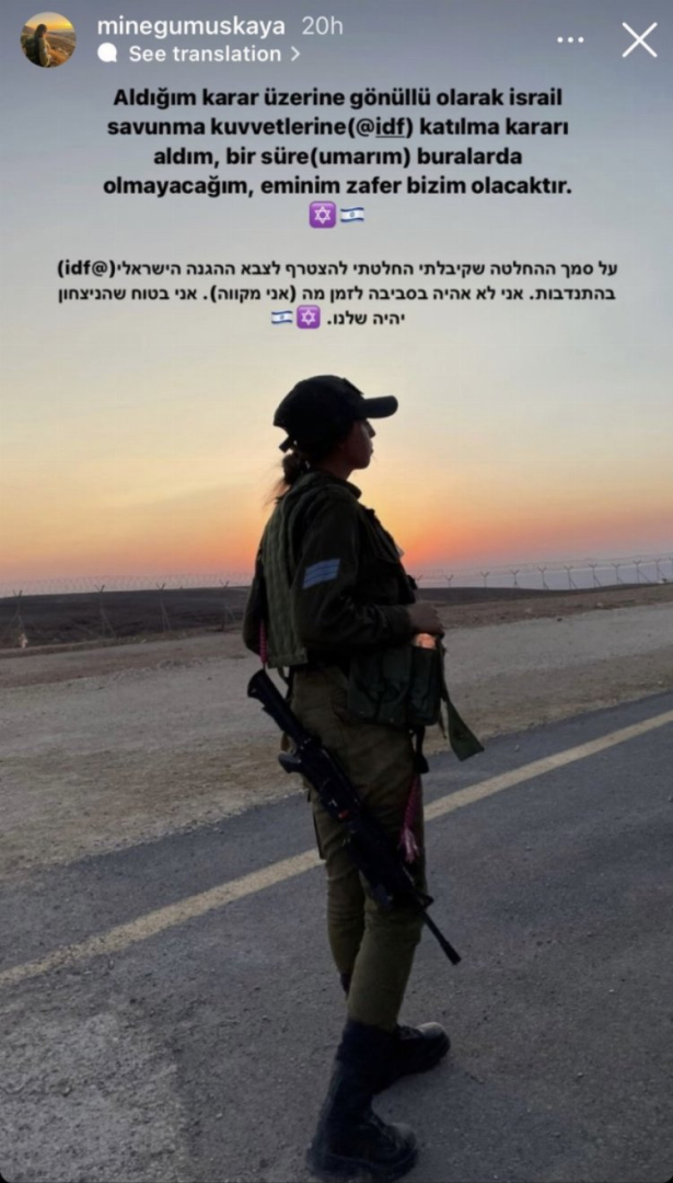 Mine Gümüşkaya sosyal medyasında paylaşmış olduğu paylaşımda üzerinde İsrail üniforması ve elinde silahlarla poz verdi. Yaptığı paylaşımda şu şekilde açıklama yaptı; “Kendi özgür hür irademle İsrail ordusuna katılmış bulunmaktayım, biraz ortalıkta görünmeyeceğim, inanıyorum ki zafer İsrail ordusunun yani bizim olacak” dedi.