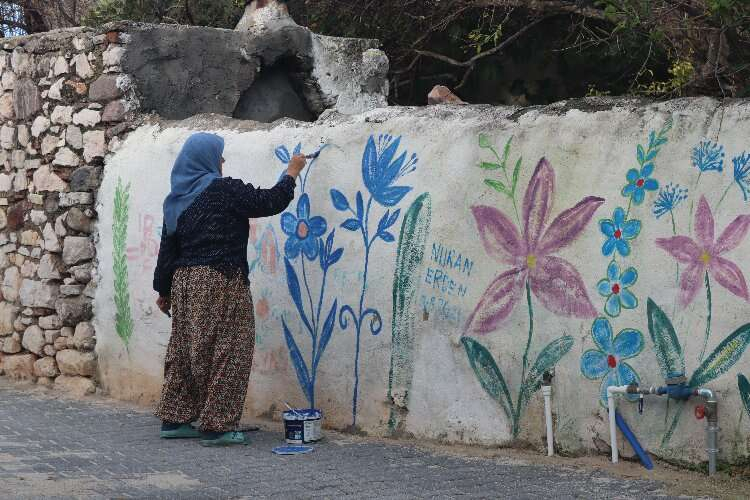 Köyde yaşayan 61 yaşındaki Nuran Erden, evindeki sandalyelerden başladığı resim aşkını köyün duvarlarına taşıdı.