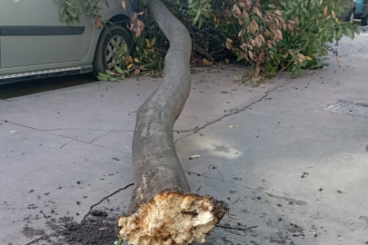 Şiddetli rüzgarda dibinden kırılan ağaç, park halindeki 2 aracın üzerine devrilerek maddi hasara neden oldu.