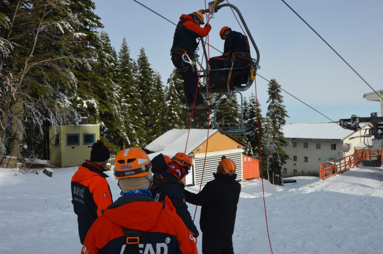 Bursa'da AFAD ve JAK ekipleri, Uludağ'da gerçekleştirdikleri kurtarma tatbikatında yürekleri ağza getirdi. Uludağ'ın karla kaplı bölgesinde 35 AFAD ve 2 tim JAK ekibi, duran telesiyejdeki kişileri sağlıklı bir şekilde yere indirmek için akrobatları aratmayacak şekilde tellerde ilerledi. Mahsur kalanlara ulaşan ekipler, onları sağlıklı bir şekilde indirmek için gereken bütün önlemleri aldı.