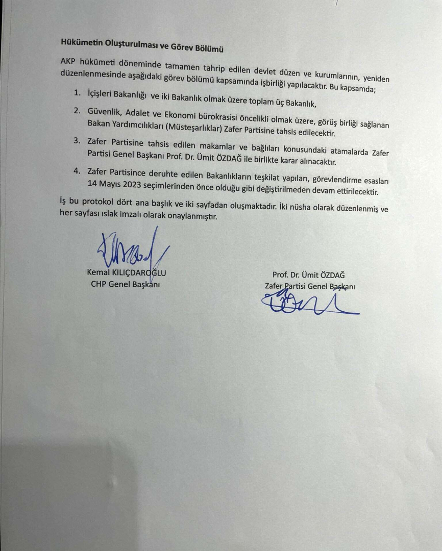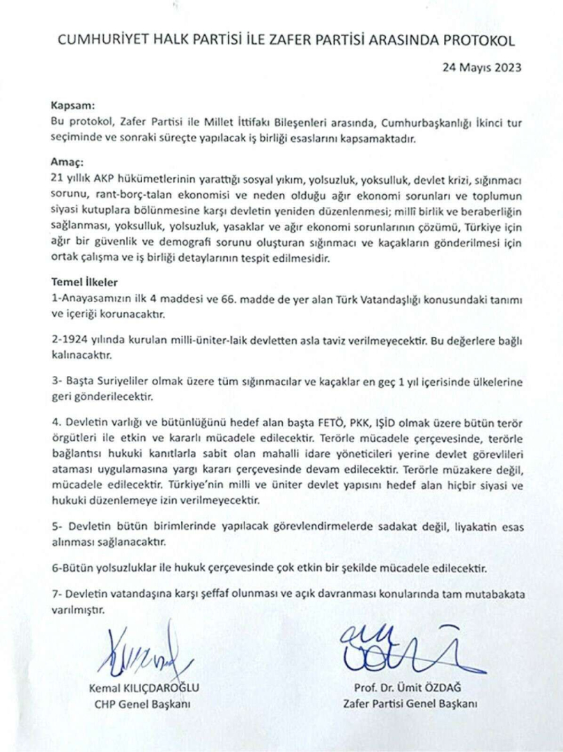 Zafer Partisi Genel Başkanı Ümit Özdağ, eski CHP Genel Başkanı Kemal Kılıçdaroğlu ile cumhurbaşkanlığı ikinci tur seçimleri öncesi yaptıkları protokolü yayımladı.
