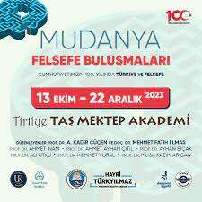 Mudanya Belediyesi’nin Bursa Uludağ Üniversitesi’nden Prof. Dr. A. Kadir Çüçen ve Karamanoğlu Mehmetbey Üniversitesi’nden Doç. Dr. Mehmet Fatih Elmas işbirliğinde 'Cumhuriyetimizin 100. yılında Türkiye ve Felsefe' temasıyla gerçekleştirdiği 'Mudanya Felsefe Buluşmaları'nın ikincisi başlıyor.