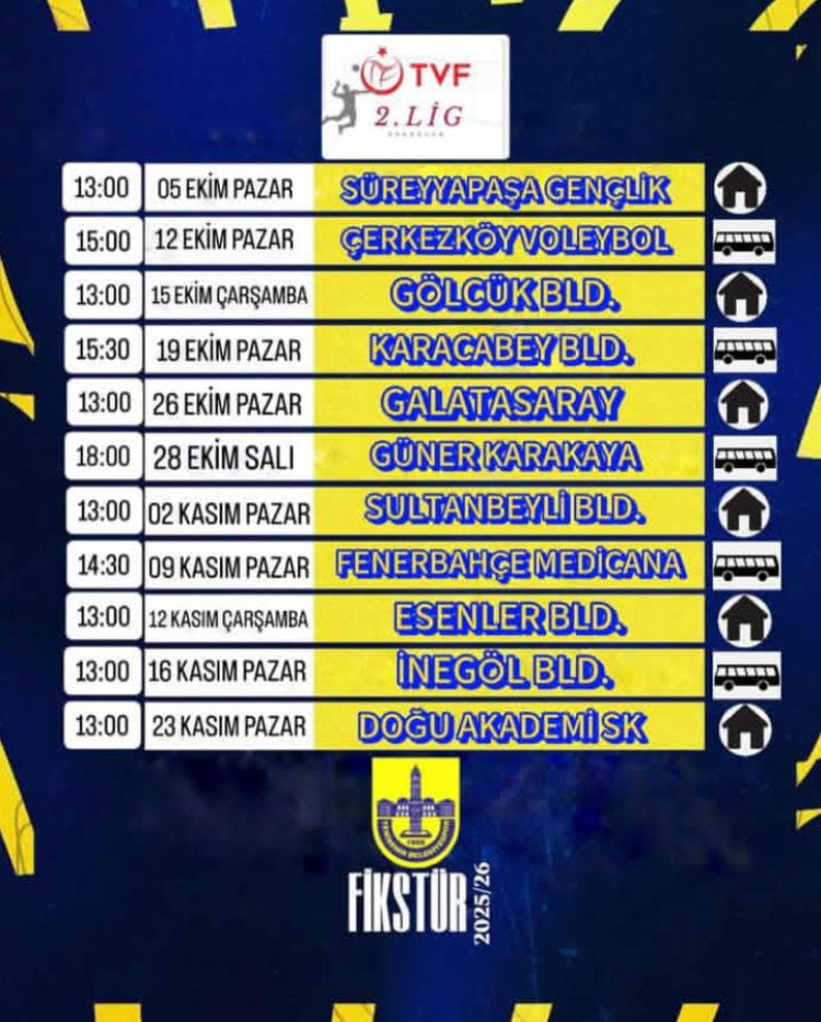 Türkiye Voleybol Federasyonu 2025-2026 Erkekler 2. Lig 2. Grup’ta mücadele edecek olan Yenişehir Belediyespor Voleybol Takımı’nın 1. devre fikstürü açıklandı.