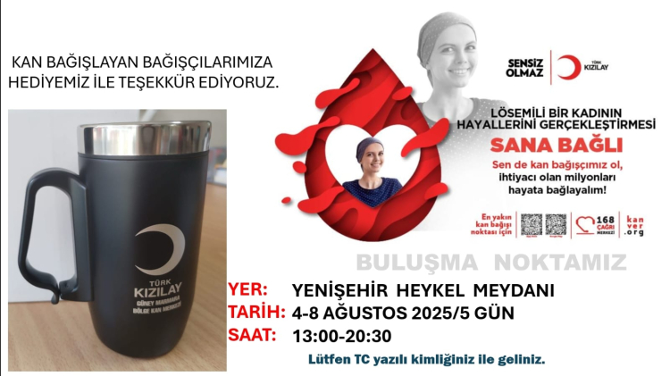 Türk Kızılayı, lösemili bir kadının hayallerine kavuşmasına destek olmak amacıyla Yenişehirli vatandaşlarımızı kan bağışına davet ediyor.