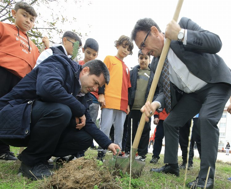 Etkinlikte Milli Eğitim Müdürlüğü yetkilileriyle öğretmen ve öğrenciler fıstık çamı fidanlarını okul bahçesine dikerek ilk bakımlarını yaptılar.