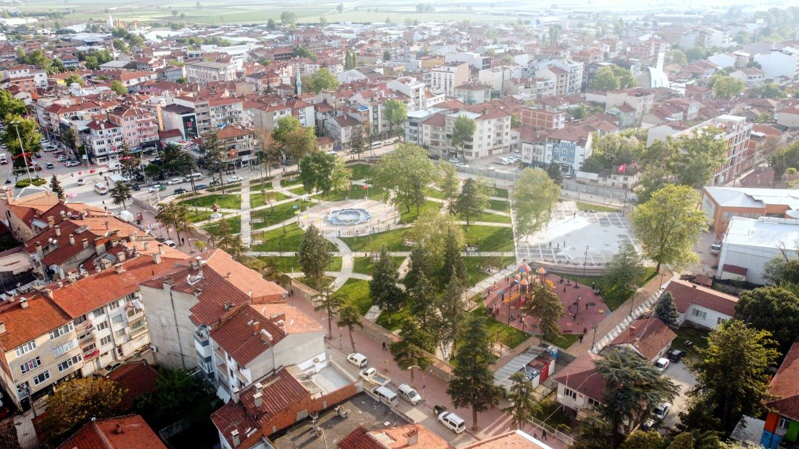 Osmanlı İmparatorluğu'nun ilk başkenti olan Bursa'nın Yenişehir ilçesinde şehir merkezinde bulunan 14 bin metrekarelik alana yapılan Osmangazi Millet Bahçesinin havadan görüntüsü kendine hayran bıraktı.