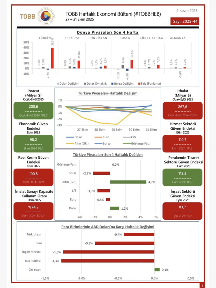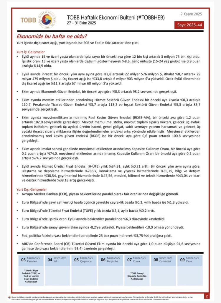 TOBB tarafından hazırlanan bültende, yurt içi ve yurt dışı ekonomik göstergeler, sektörel güven endeksleri, ihracat-ithalat verileri ve küresel piyasalardaki haftalık değişimler detaylı biçimde değerlendirildi.