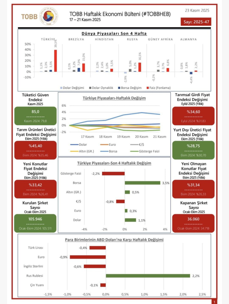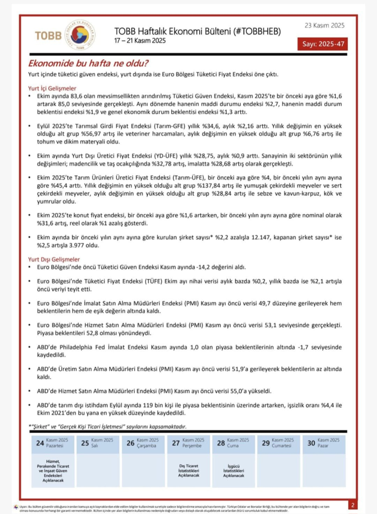 Yenişehir Ticaret Borsası, 17–21 Kasım 2025 tarihleri arasında Türkiye ve dünya ekonomisindeki güncel gelişmeleri içeren TOBB Haftalık Ekonomi Bülteni’nin yayımlandığını duyurdu.
