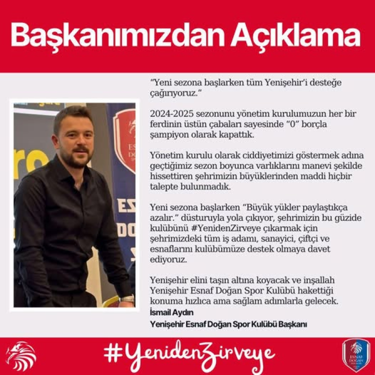 2024-2025 sezonunu “0” borçla ve şampiyonlukla tamamlayarak önemli bir başarıya imza atan Yenişehir Esnaf Doğan Spor Kulübü, yeni sezon öncesi kamuoyuna seslendi.
