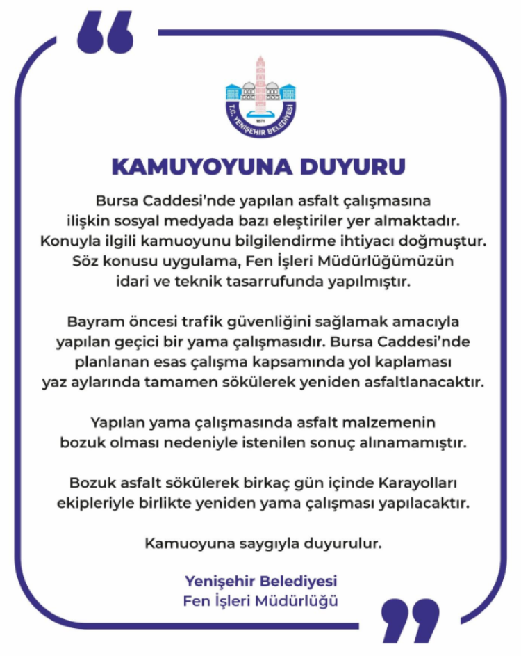 Yenişehir Belediyesi, Bursa Caddesi'nde gerçekleştirilen asfalt yama çalışmasına yönelik sosyal medyadaki eleştirilere ilişkin resmi bir açıklama yaptı. Belediye, çalışmanın bayram öncesi trafik güvenliği amacıyla yapılan geçici bir uygulama olduğunu duyurdu.