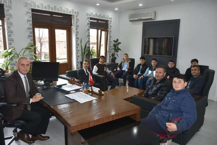 2'ncisi olan Koç Ortaokulu öğrencileri, Kaymakam Rahmi Köse'yi ve Belediye Başkanı Davut Aydın'ı makamında ziyaret ettiler.