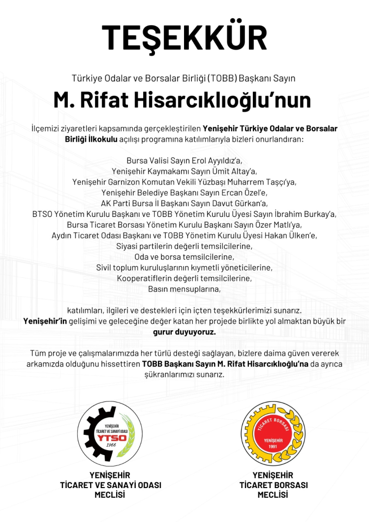 Türkiye Odalar ve Borsalar Birliği (TOBB) Başkanı Mustafa Rıfat Hisarcıklıoğlu’nun Yenişehir ziyareti kapsamında açılışı gerçekleştirilen Yenişehir Türkiye Odalar ve Borsalar Birliği İlkokulu törenine katılan tüm davetlilere teşekkür edildi.